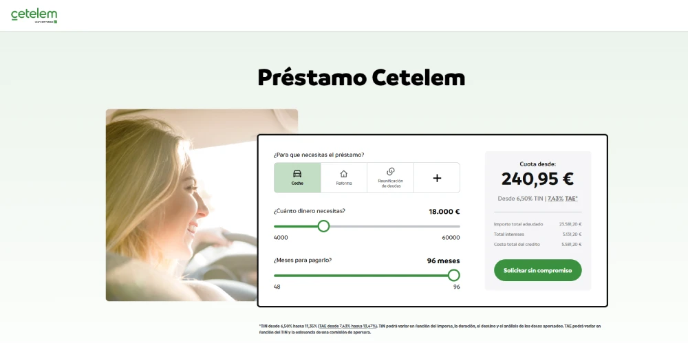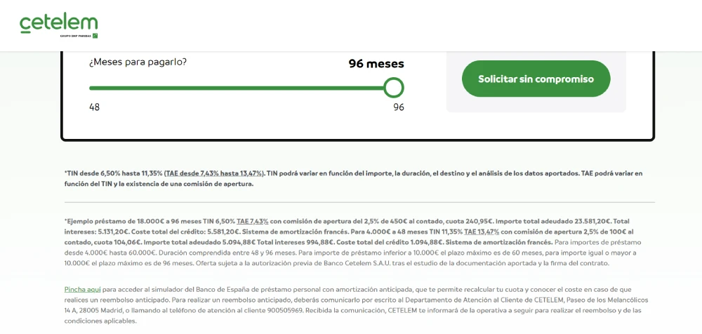 Cetelem es un prestamista que está especializado en operaciones de una cierta cuantía, con un motivo concreto y para personas solventes. No en vano, se pueden obtener desde 4.000 a 60.000 euros, a devolver entre 48 y 96 meses.