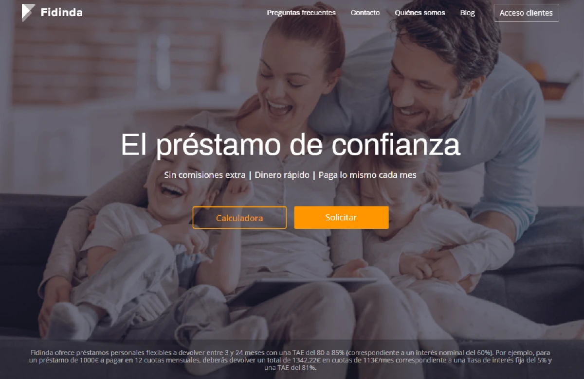 Fidinda es un prestamista que, aunque está registrado en Malta, opera en España. Proporciona préstamos rápidos de entre 500 y 5.000 euros, a devolver entre 3 y 24 meses. Otro elemento destacable es que acepta solicitudes de personas con ASNEF.
